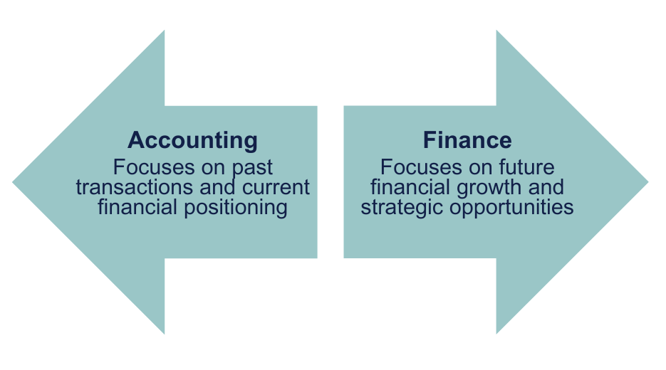 The main difference between finance and accounting is in their scopes and goals. At its most basic, accounting focuses on looking at past transactions to determine current financial positioning while finance deals with analysis and strategy to support future growth.