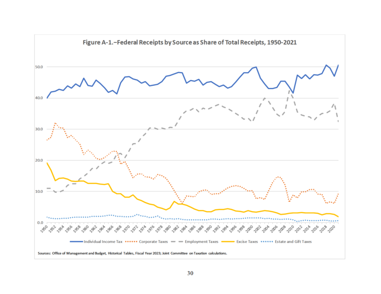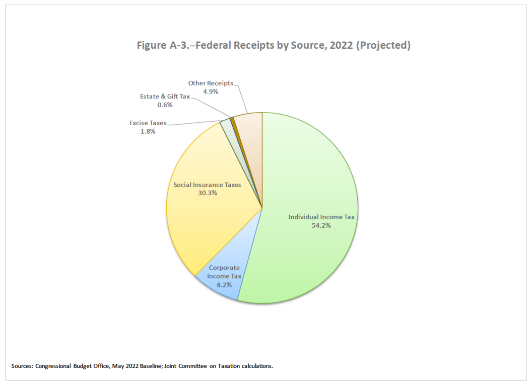 The individual income tax is expected to account for 54.2% of Federal receipts in 2022. This means the individual income tax will continue to be the largest source of revenue for the Federal government.