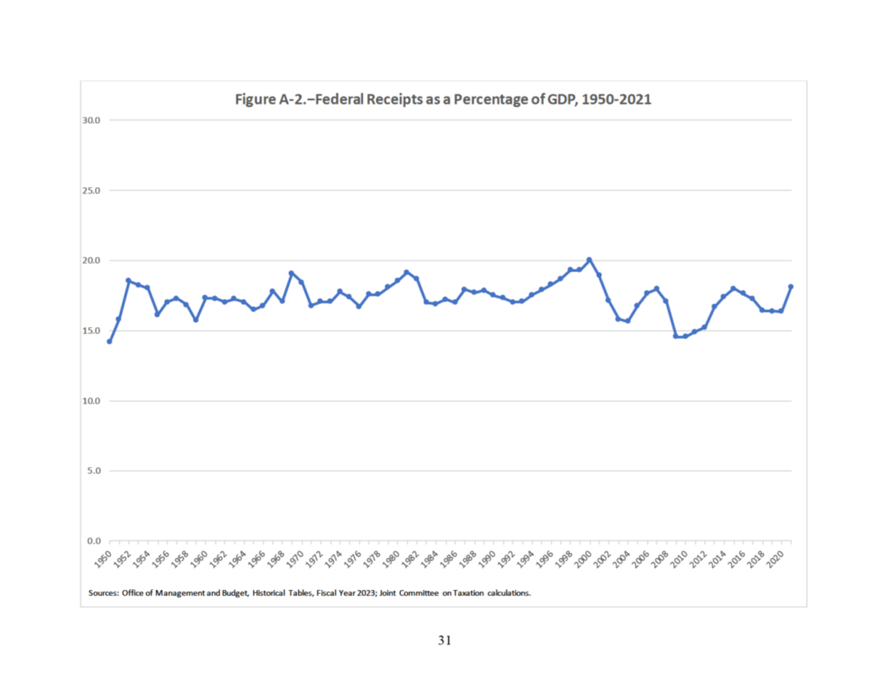 Perhaps the most interesting statistic is the fact that Federal receipts as percentage of GDP have remained between 16-18% over the last 75 years, regardless of changes in the economic environment and fluctuations in marginal tax rates.