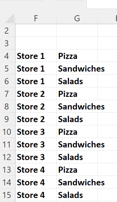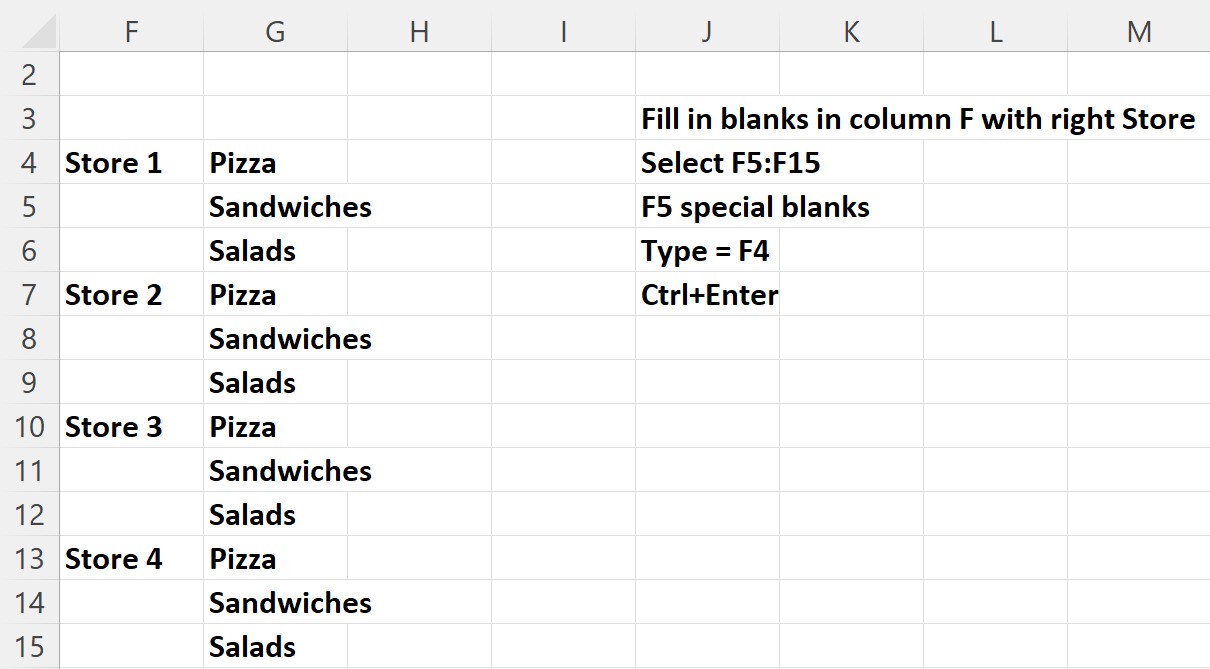 To easily fill in the blank rows in column F with the correct store, complete the following steps: