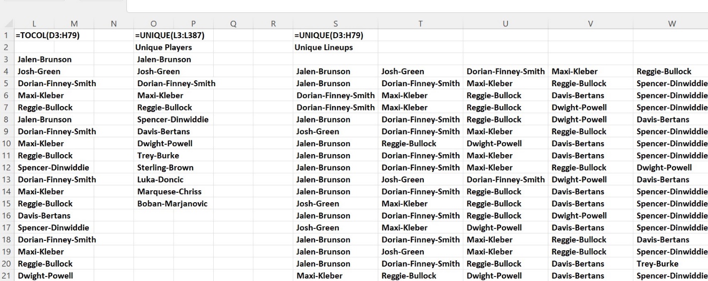 To find a list of unique Maverick lineups, enter in cell S3 the formula =UNIQUE(D3:H79). This formula worked across five columns and returned all (48) unique lineup combinations.