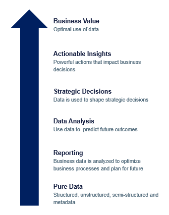 A key question becomes, "How can individuals and teams explore the value of data as they generate reports, conduct analyses and make strategic decisions?" The answer to this question is best displayed in the image below, which reflects the value of data from its lowest form to its optimal level.