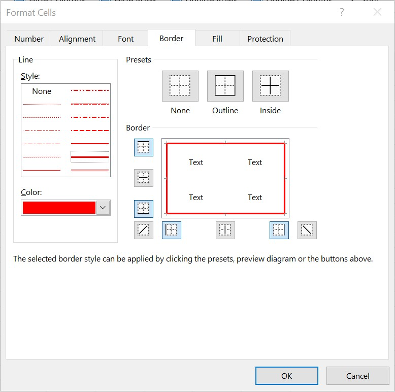 16. The Format Cells dialog box opens with the Border tab displayed. Select the settings shown in Figure 8 and select OK. These settings will create a bold red border around the selected cells.