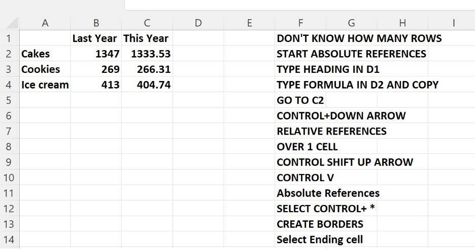 9. Press Ctrl+down arrow to move to the bottom of column C. That way, even if you change the number of products, this step will end at the bottom of your data.