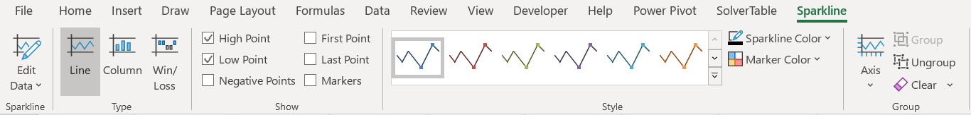 Figure 1 (see the worksheet "Line") shows an example of sparklines.