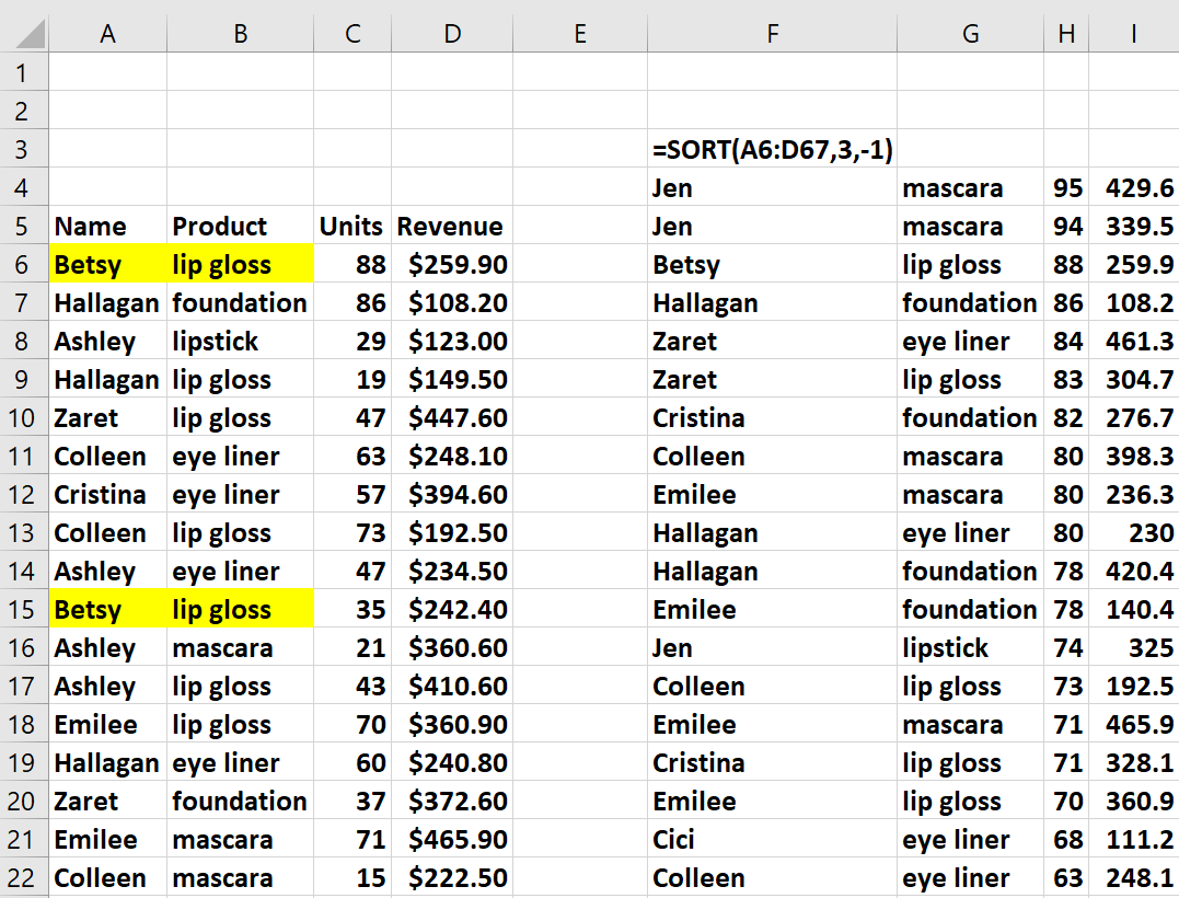 Note that the first SortOrder argument of -1 results in a sort of units (based on C6:C67) in descending order while the second Sort_Order argument of +1 results in ties in unit sales being broken by an A-Z sort based on the salesperson.